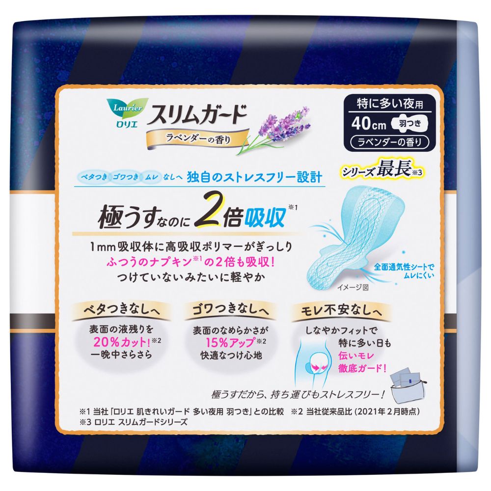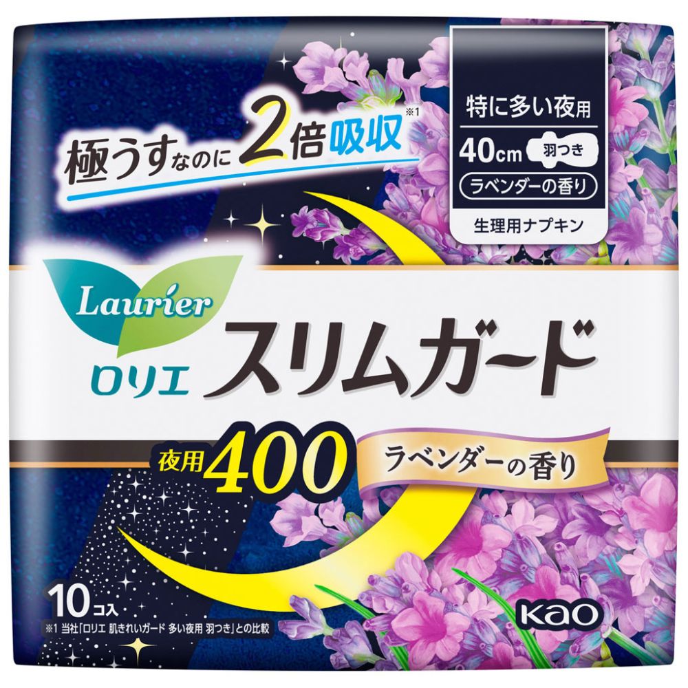 KAO LAURIER SLIM GUARD NIGHT PADS WITH WINGS LAVENDER FRAGRANCE 40CM 10 PADS - ULTRA THIN, DOUBLE ABSORPTION FOR HEAVY FLOW