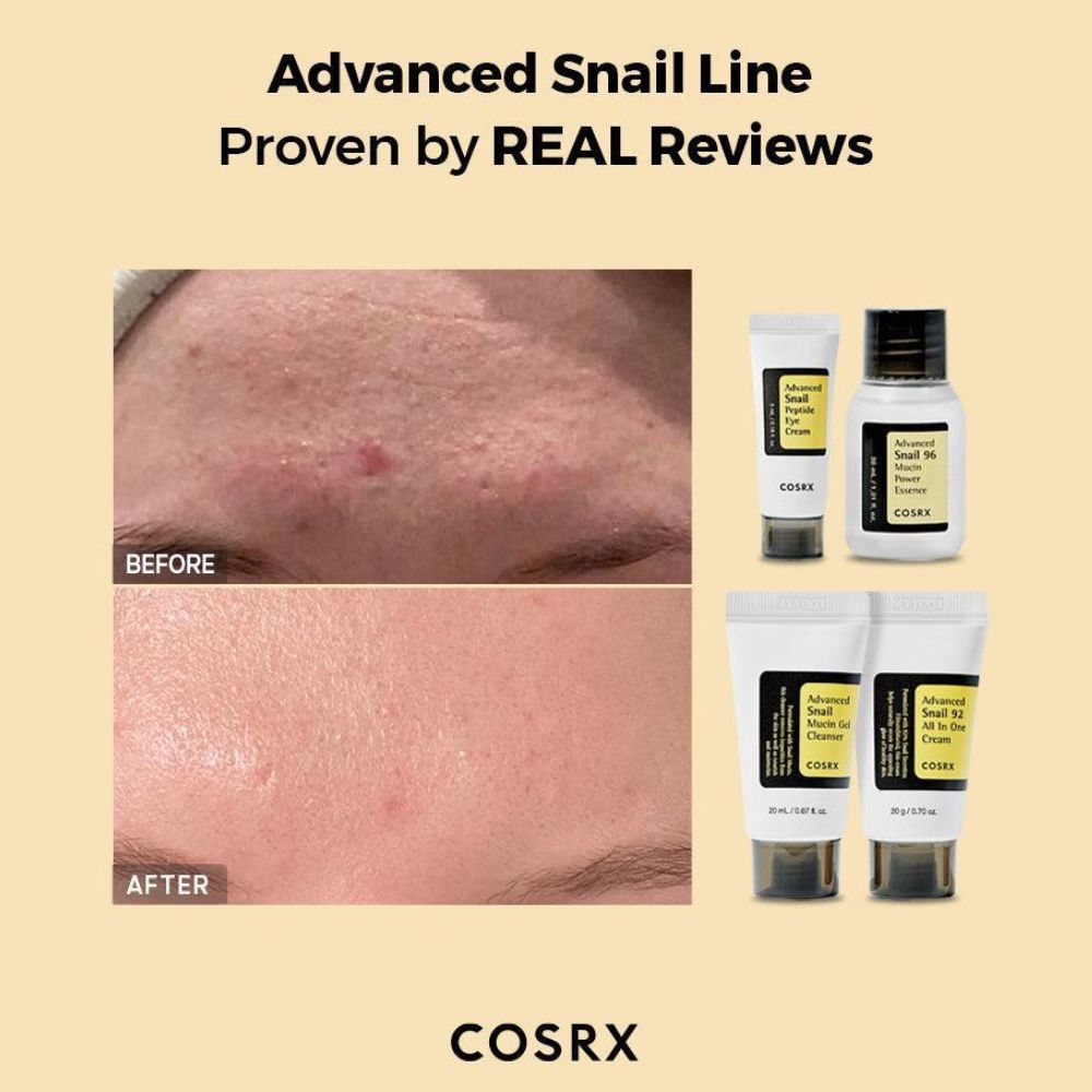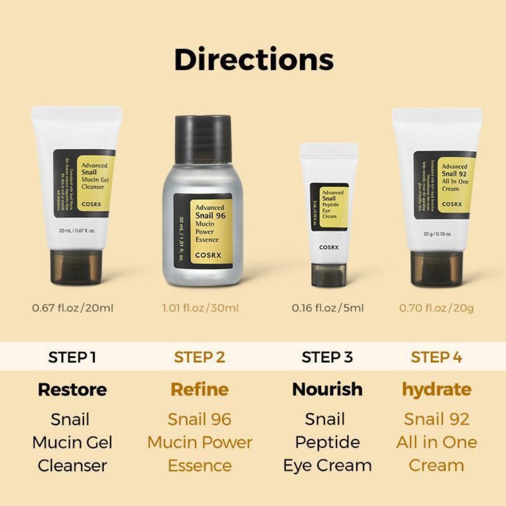 COSRX's Most Loved 4-step Advanced Snail Trial Kit : Skincare essentials formulated with snail mucin for repairing, moisturizing, and soothing skin.
